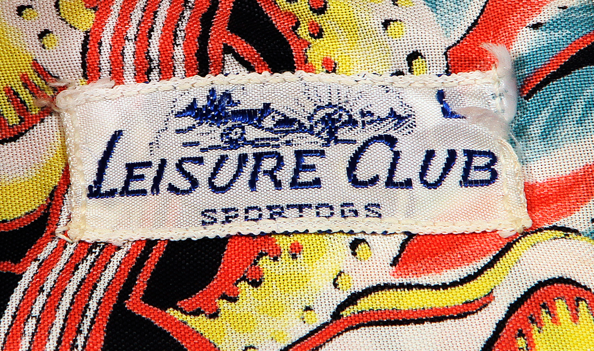 Leisure Club was a mainland sportswear manufacturer in the 1950's. Large retail stores across the country sold newly popular "sport shirts" printed with creative designs and inspiration from Hawaii. The label has an interesting motif of a sunrise over a mainland looking landscape and country house. Leisure Club also used the word "Sportogs" on the label which loosely translated referred to "clothes for sport" or "sportswear".