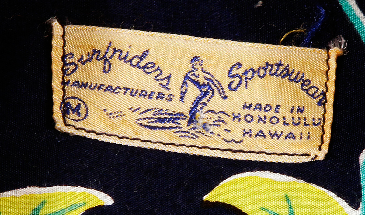 The words Surfrider Sportswear were laid in 2 wave like curves with a classic Waikiki surfer as the focal point of their logo and woven labels. They are regarded as one of the great Aloha Shirt and Women's Wear makers of the "Golden Era".