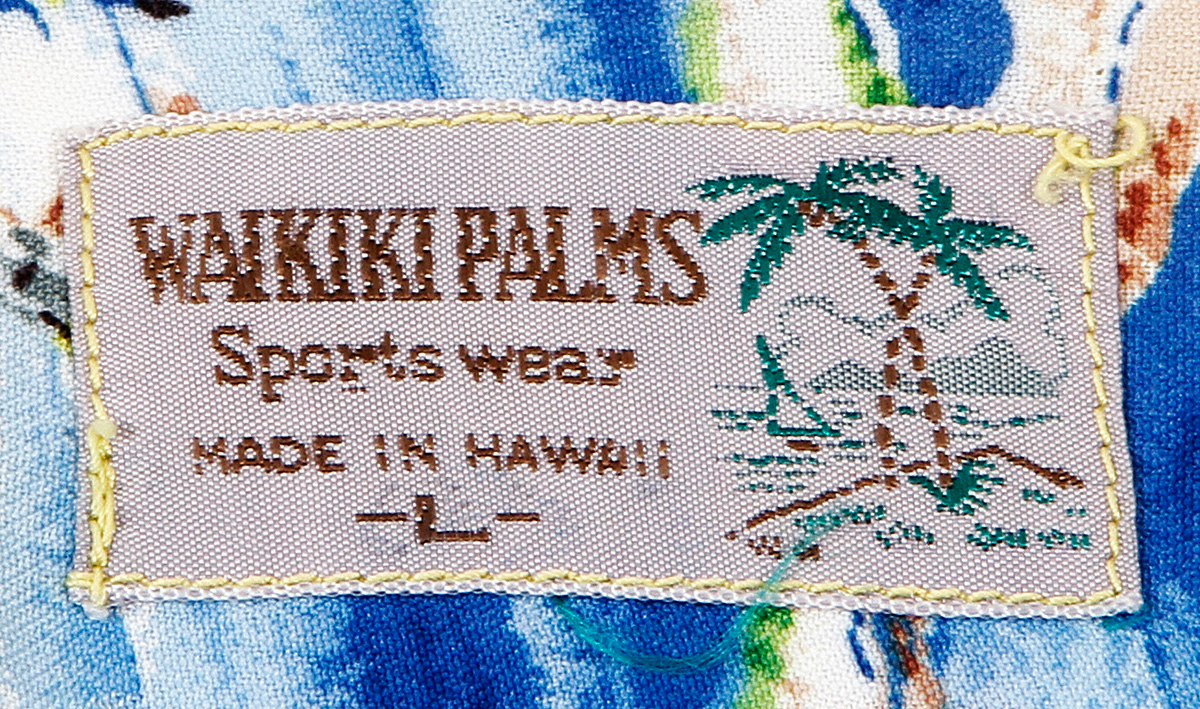 Waikiki Palms Sports wear was a small shirt maker from Hawaii in the mid 1950s. The colors in their label and image of the coconut trees, sailboat and distant mountain are all similar to an original Beachtowne Andrade Honolulu label that was made in the late 1940s.